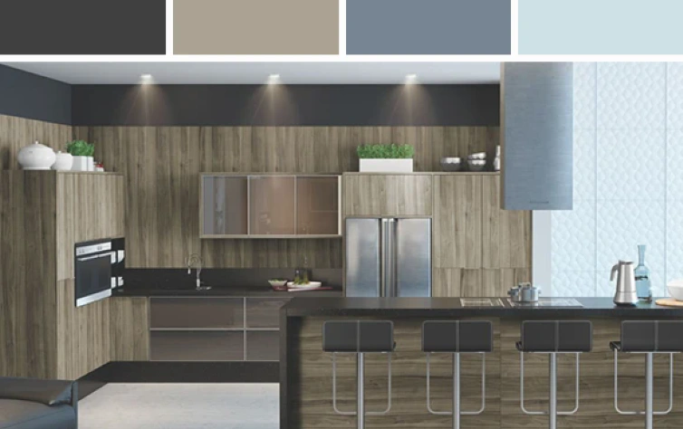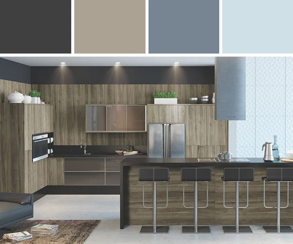 Tá aí o modelo que traz o melhor da natureza para dentro de casa: as texturas amadeiradas dessa cozinha, mesclando tons de azul, relembra o estilo rústico, o que contrasta com essa mobília supermoderna. Os acoplados nas paredes deixaram o ambiente mais funcional, além da bancada, dividindo o espaço com outro cômodo de forma bem moderna.