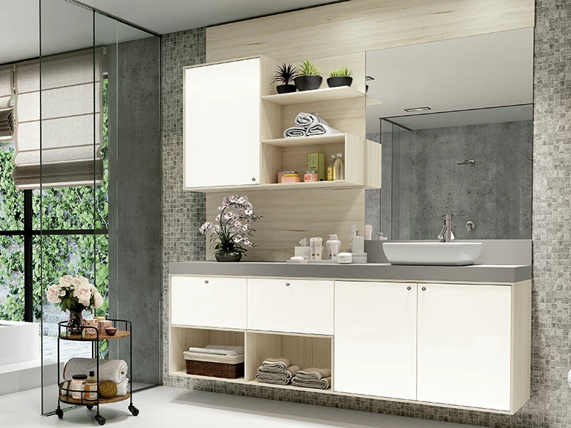 Um dica é apostar em cores claras nas paredes e no piso, para trazer amplitude e utilizando móveis com tamanhos e estilos adequados no ambiente. Você também pode apostar em algumas texturas, como o exemplo acima. Os móveis planejados da Italínea contam com divisões internas, prateleiras e nichos, que ajudam a manter o banheiro organizado.